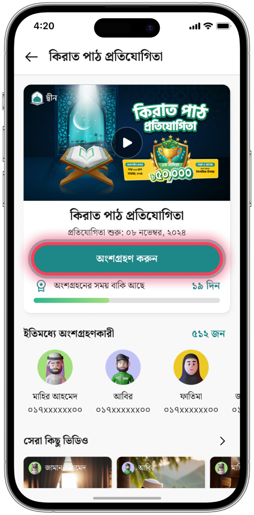 সেরা ২০ এ থাকা প্রতিযোগিদের ভিডিও দ্বীন অ্যাপে প্রদর্শন এবং এবং Love/ Like রিয়্যাকশন এর মাধ্যেম ভোটিং শুরু